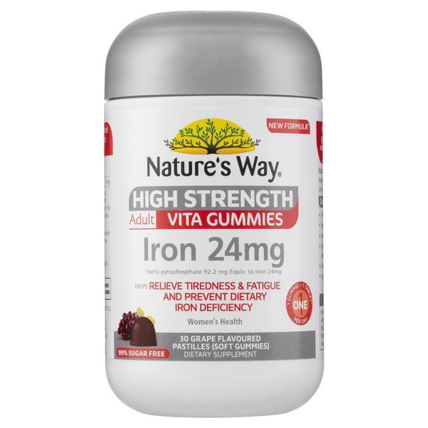 Nature's Way High Strength Adult Vita Gummies Iron 24mg is a high strength, one-a-day supplement with 24mg of iron to help relieve tirednees & fatigue and prevent dietary iron deficiency.