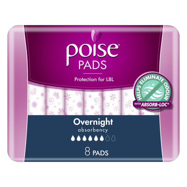 Poise Pads Overnight offer discreet protection and added absorbency for when light bladder leakage occurs overnight, for larger amounts of liquid leakage (up to 2 cups). Poise Overnight Pads are 4 X more absorbent than leading night period pads.