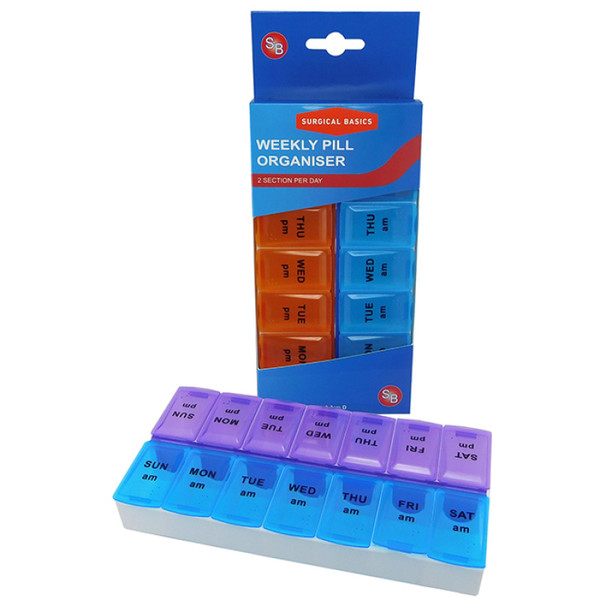 Description Surgical Basics 2 Per Day Weekly Pill Organiser Additional Details UPC: 9312061400388 Barcode: 9312061411383